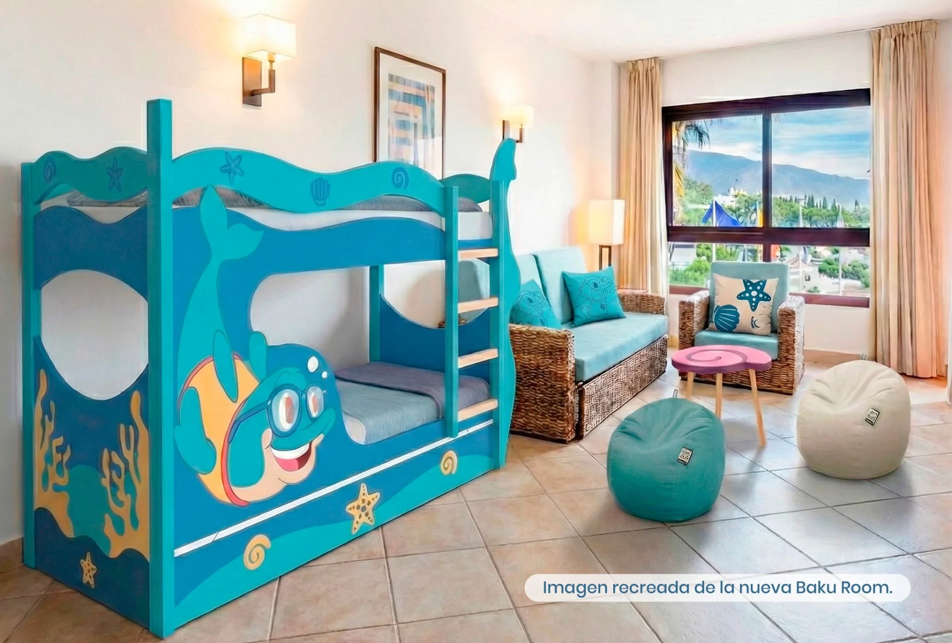 Desde el momento en que se abre la puerta, empieza la aventura. Las Baku Rooms incluyen: litera temática personalizada con ilustraciones de Baku, decoración con detalles marinos que transportan al universo Baku, welcome pack infantil para cada niño y late check-out, sujeto a disponibilidad.